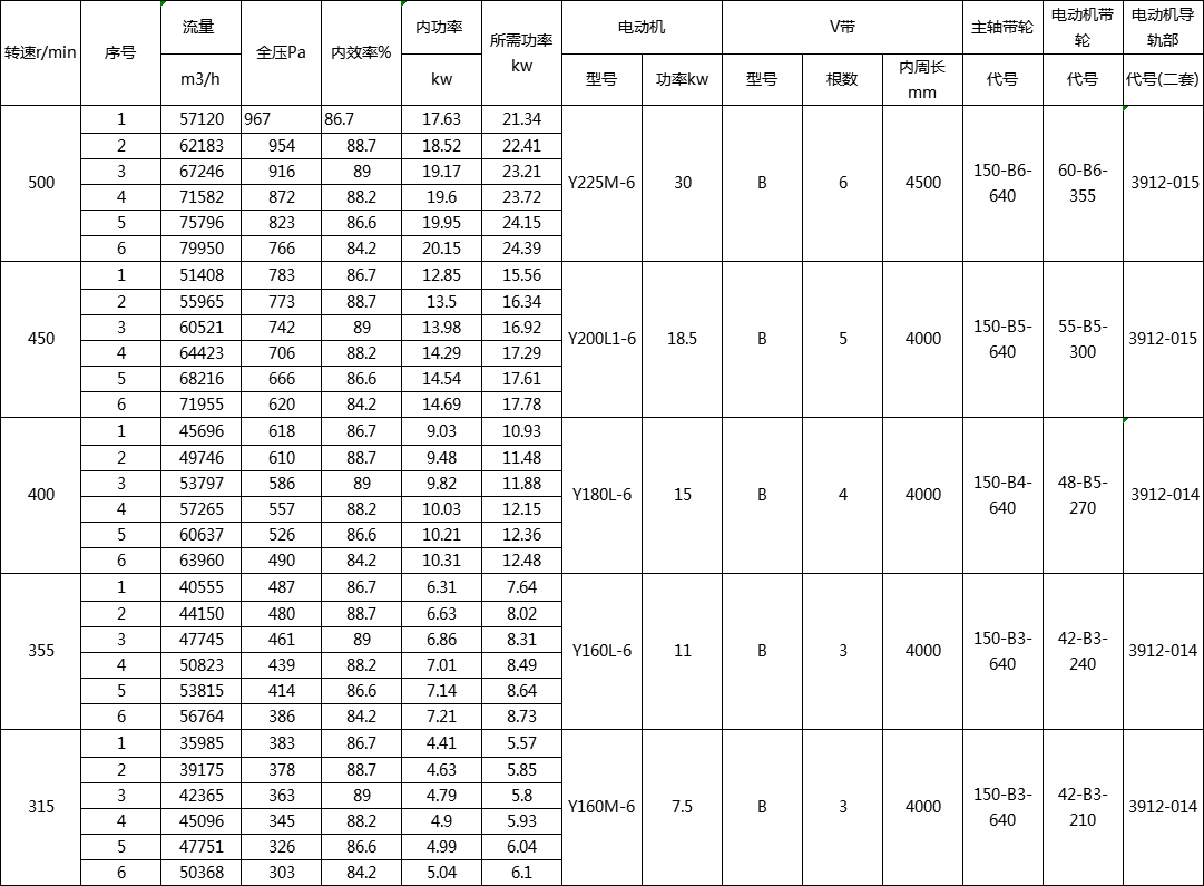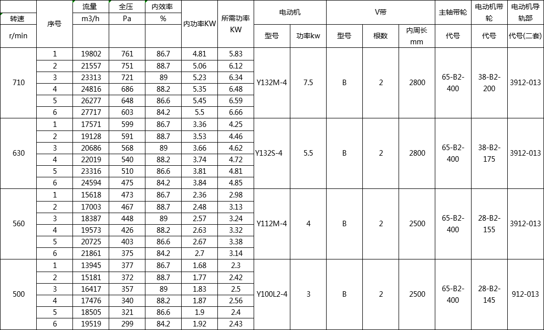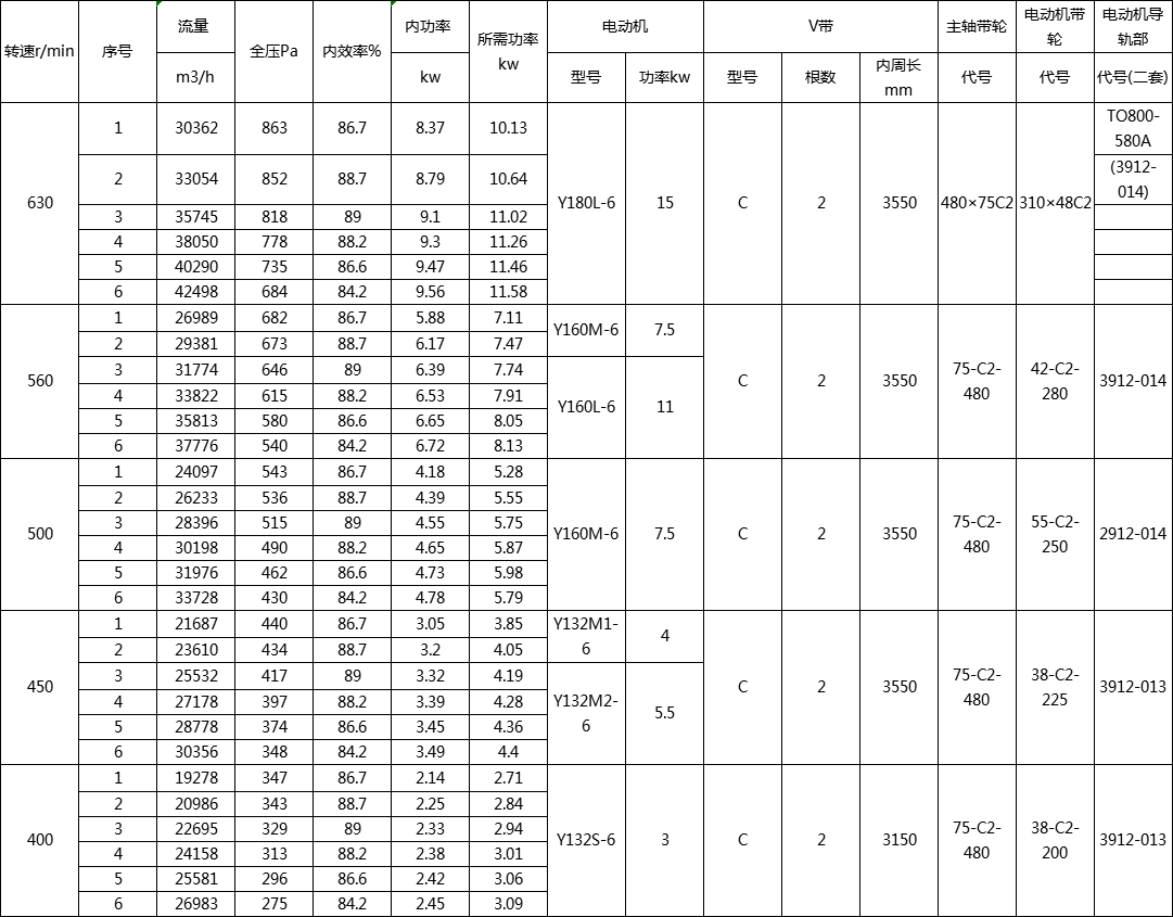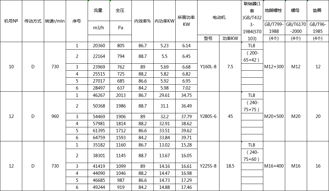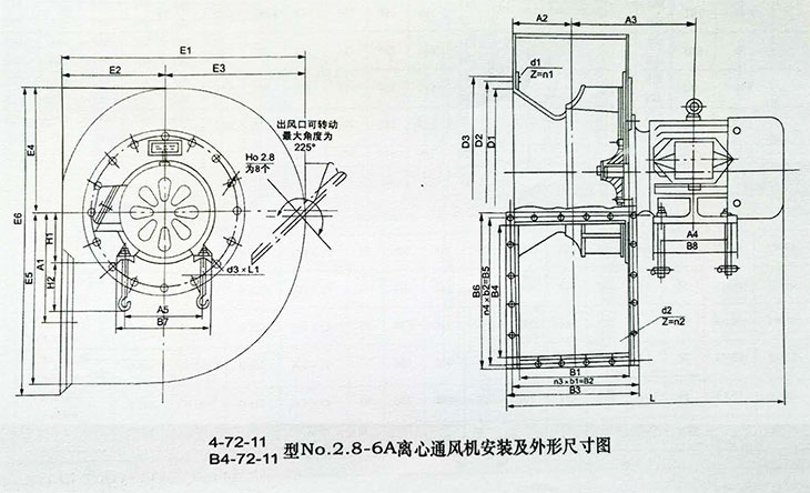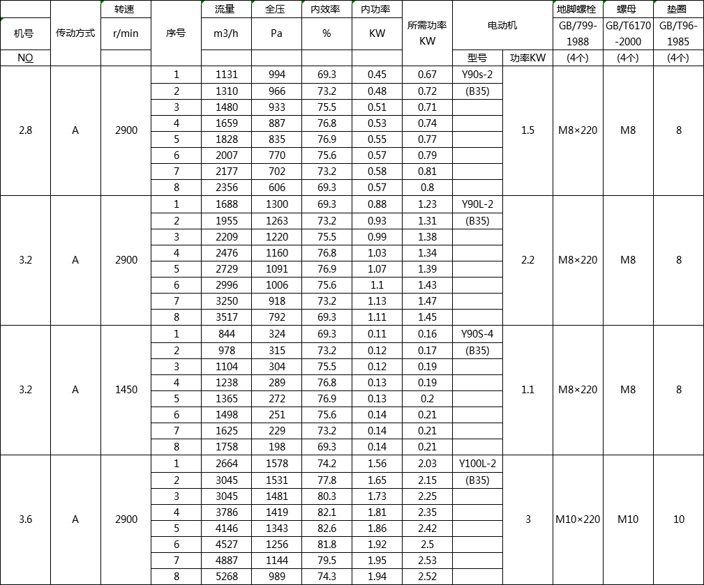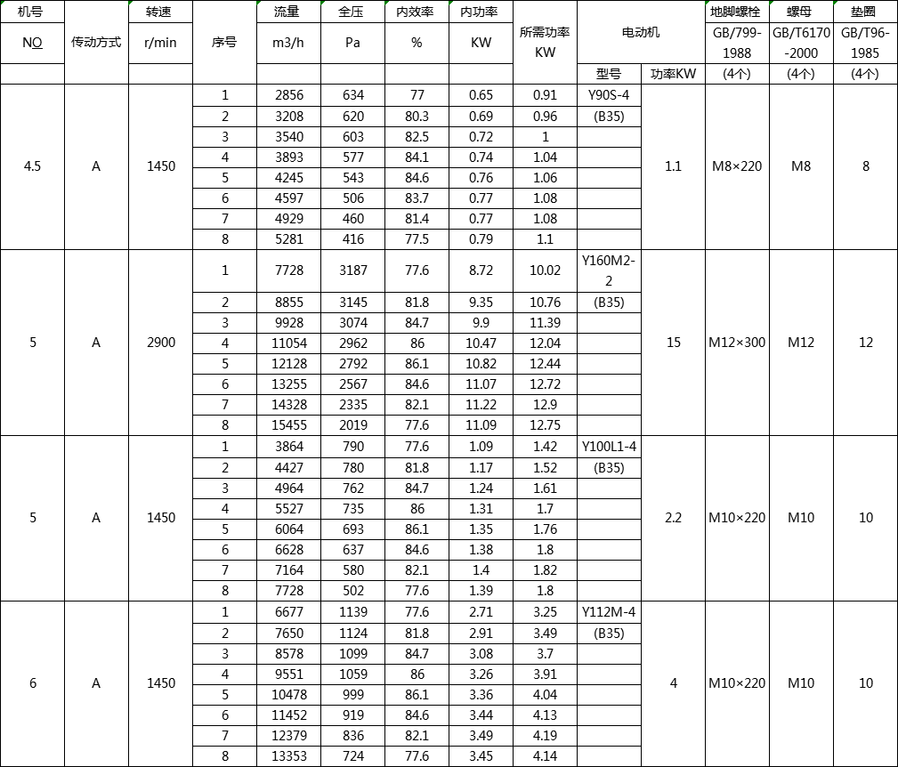 B4-72型风机的性能与选用件及地基尺寸与4-72型一致,可按其样本选择。该风机结构基本与4-72型相同,NO2.8~6A采用B35型带法兰盘与底脚的电动机, NO6~12C、D电动机选用该表中与Y系列对应的YB系列,安装型式为B3。