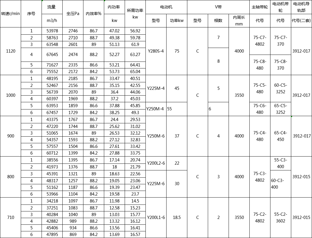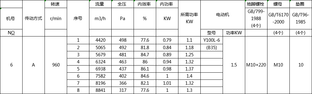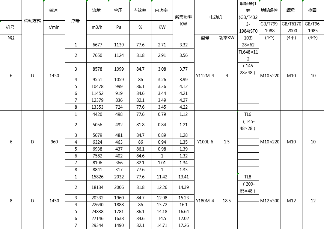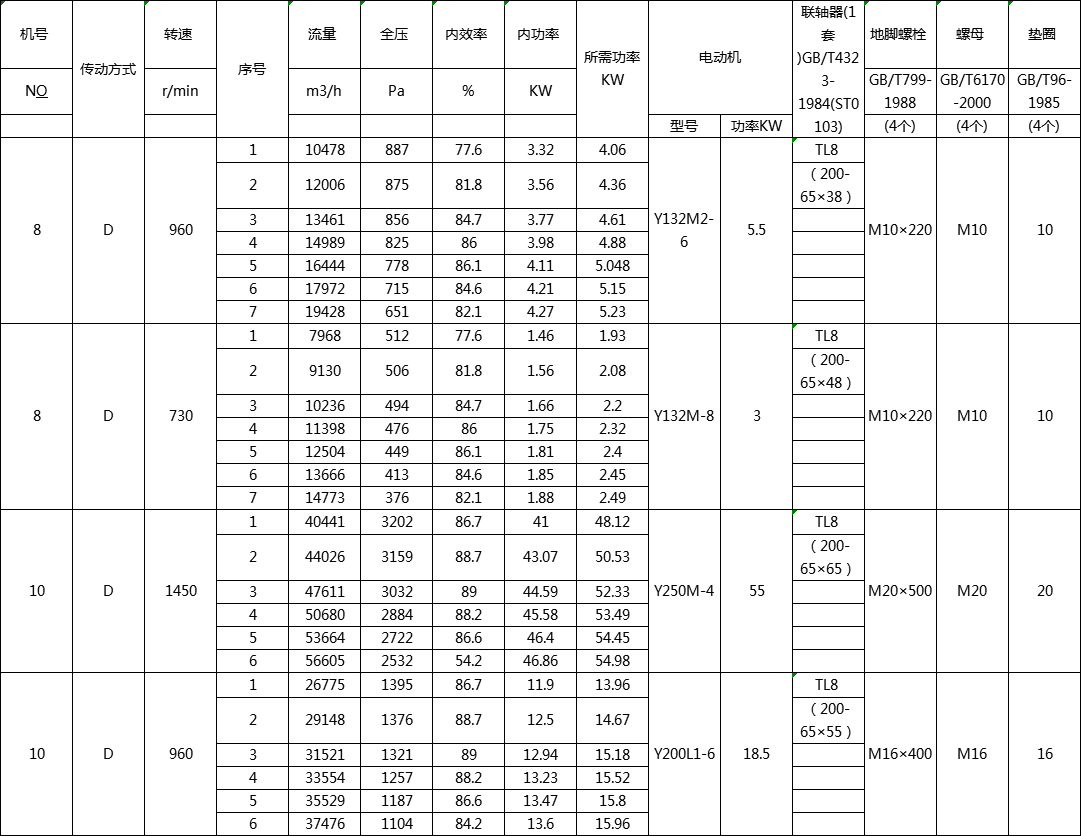 本样本只给NO.10样机的无因次性能表及曲线(见下图)、由该性能表和曲线计算NO.10以上风机的有因次性能参数。